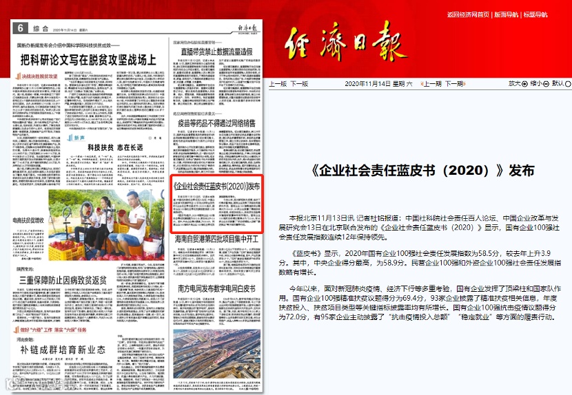 2020年11月13日,央视财经频道报道《企业社会责任蓝皮书(2020)》
