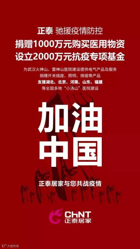 2月8日,正泰已将捐赠金额从100万美元追加至1000万元人民币,继续在全球加大医用物资采购力度支援防疫一线,并设立2000万元抗疫专项基金,坚决助力打赢疫情阻击战。同时,正泰集团在国际范围内紧急采购防护用品,48小时内完成33000套防护服采购、60个小时完成100万只医用口罩采购,并在第一时间运抵各大防疫定点医院,紧急驰援防疫一线!