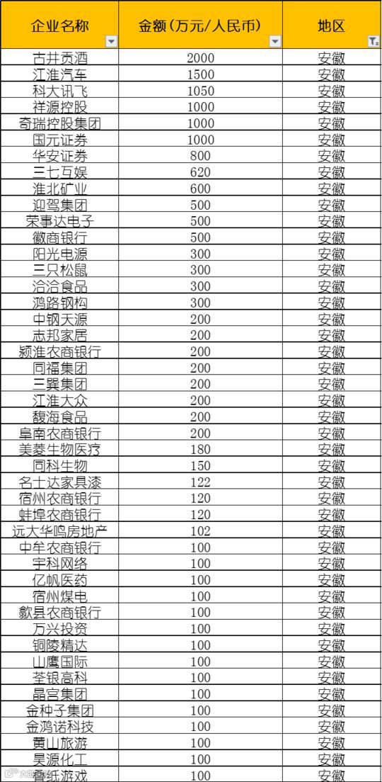 安徽省参与企业45家,捐赠总额1.6164亿元。捐赠金额排名前五的企业依次为古井贡酒、江淮汽车、科大讯飞、祥源控股、奇瑞控股集团。