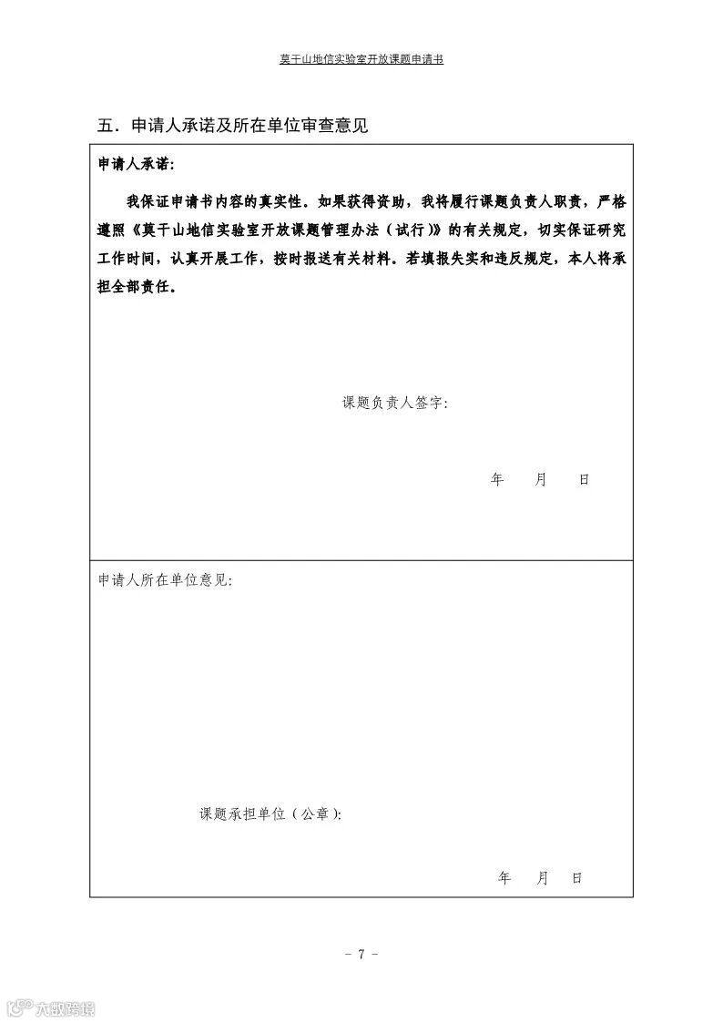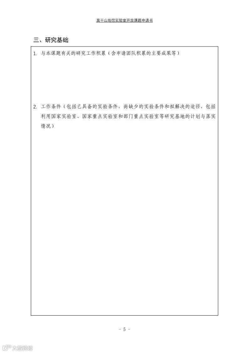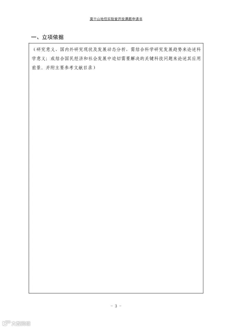 (三)申请人需填写《实验室开放课题申请书》,要求研究目标、指标、内容明确,技术路线科学有效,经费测算真实合理,成果定量可考核,由课题负责人签字和所在单位审核同意后加盖单位公章,于2024年11月15日前将电子版(申请书Word文件、签字盖章页的PDF文件)及1份签字盖章的纸质申请材料提交实验室,电子版以电子邮件收到时间为准,纸质材料以寄出邮戳时间为准。