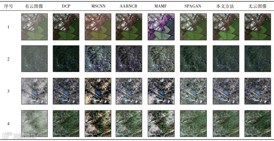 本文方法与DCP[1]方法、Ren等[17]开发的多尺度卷积神经网络 (multi-scale convolutional neural network, MSCNN)、Dhara等[18]提出的自适应大气光细化与非线性色彩平衡去云算法 (adaptive airlight refinement and non-linear color balancing, AARNCB)、Cho等[19]提出的模型辅助的多波段融合算法 (model-assisted multiband fusion, MAMF) 以及SPAGAN[7]方法共5种薄云去除方法进行实验对比。为了客观进行实验对比,利用本文建立的数据集重新对SPAGAN模型进行了训练。