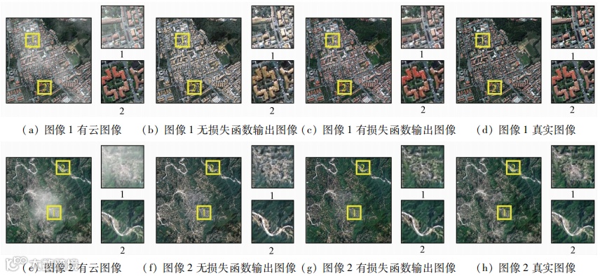 为验证本文设计的细节损失函数Ls和颜色损失函数Lc的作用,设置了有无2个损失函数的消融实验,结果如图6所示,其中黄色框1为薄云部分,黄色框2为原图中无云部分,图像右侧为对应黄色框1和2的放大细节图像。在图像颜色方面,如图像1城市图像,房屋部分在没有损失函数的输出结果中,屋顶颜色与原始图像相差较大,而有损失函数的输出结果其颜色还原程度与原图近似,接近真实图像。在图像细节方面,如图像2中,无锐化损失函数的输出结果山峰及道路的细节模糊,图像层次被降低,而有锐化损失函数的输出结果中图像既能保证无云部分的细节,又能将有云部分的细节加强。