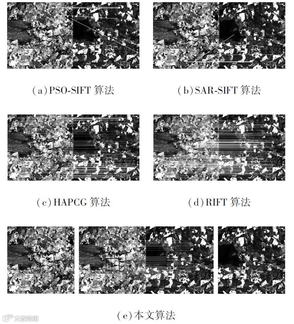 为衡量算法匹配性能,将本文算法与PSO-SIFT算法、SAR-SIFT算法、HAPCG算法以及RIFT算法在两组SAR与光学影像中进行匹配,从正确匹配点数(number of correct matches,NCM)、匹配成功率(matching success rate,MSR)、均方根误差(root mean square error,RMSE)以及匹配时间(time)四个方面进行对比分析。本文算法使用的匹配模板尺寸为61像素×61像素,其余算法均使用其默认参数,匹配容差为2像素,匹配结果如图3~图4所示,具体匹配数据如表2所示,表中“—”表示匹配失败RMSE无效。可知,PSO-SIFT算法与SAR-SIFT算法在两组实验影像中的匹配均失效,而HAPCG算法与RIFT算法成功匹配且匹配点对分布均匀。本文算法在第一组数据中的NCM小于RIFT算法并且匹配点对分布不够均匀,这是因为第一组数据存在的梯度反转情况导致部分边缘提取位置有偏差,大部分匹配点对在双向一致性约束下被剔除,个别匹配点产生偏移,这也导致本文算法在第一组数据中的RMSE略微低于HAPCG算法与RIFT算法。但是第一组数据中本文算法的MSR分别是HAPCG算法与RIFT算法的8.46倍与1.03倍,同时匹配时间分别是HAPCG算法与RIFT算法的28.60%与62.48%。在第二组数据中,本文算法在匹配时间上具有明显优势,用时仅有HAPCG算法与RIFT算法的11.23%与25.35%,因为第二组数据的边缘特征丰富且整体边缘分布较为均匀,使用了更高的图像金字塔层数且待匹配点邻域半径可以更小。同时算法匹配精度未受到明显影响,其RMSE略低于HAPCG算法与RIFT算法,分别是其90.4%与87.60%。