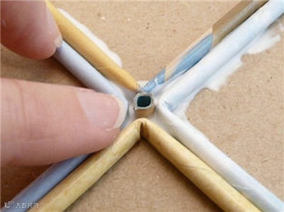 5、将所有卷好的纸棒对折,沿着刚才纸盒底盖的对角线用乳胶把纸棒逐一粘在上面。正中心空白的位置,我们可以剪下一小段纸棒筒把它填满;