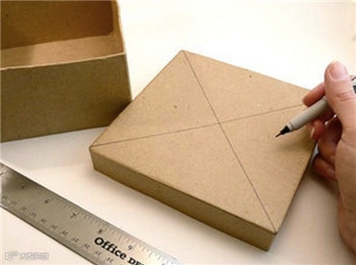 4、用铅笔在纸盒的盒盖和盒底画上对角线;