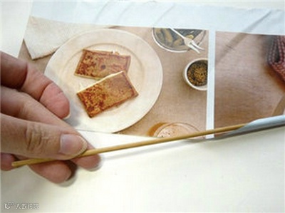 2、用一根竹签为芯子,从杂志纸的一角开始把纸卷成纸棒;