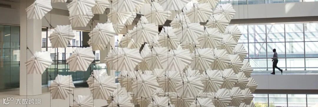 《扩散合唱团》的动力运作方式来源于集群现象的影响,这个装置作品通过模拟想像一群看不见的鸟群的运动来赞美协作的有机美感。400个折纸物件在阳光充足的中庭组成了一个悬挂体块。每个元素都可以独立打开和关闭,由运行集群算法的软件控制。
