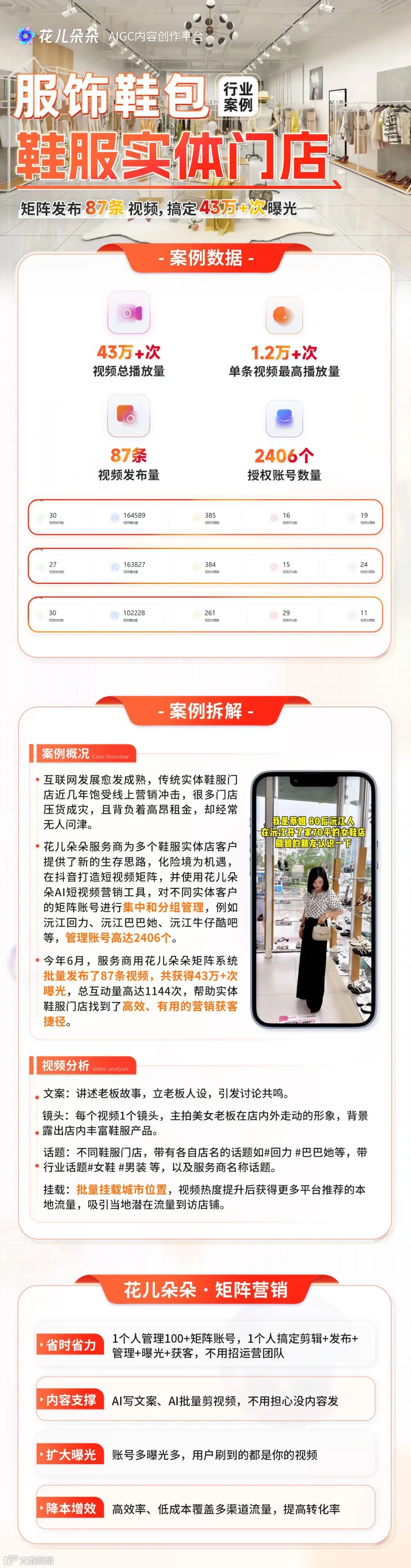 像沅江回力、沅江巴巴她、沅江牛仔酷吧这样的鞋服实体门店,以前由于时间精力不足,可能手上就1个账号,而且1天最多发3条视频。现在有了花儿朵朵矩阵营销工具,可以轻松管理100+账号,每个账号发10条,成百上千条视频分发根本不成问题!