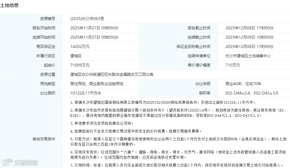 [2025]长沙市063号地块出让面积10.12万方,住宅地块容积率≤2.4,商业地块容积率3.0;计容建面约15.69万方。起始价71009万元,起始楼面价约2804元/平米。
