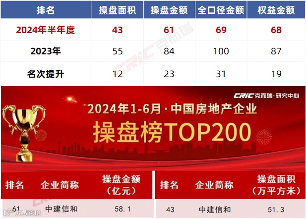 2024上半年,中建信和业绩居全口径和操盘榜销售榜金额TOP3,是本土房企中排位最高的企业。
