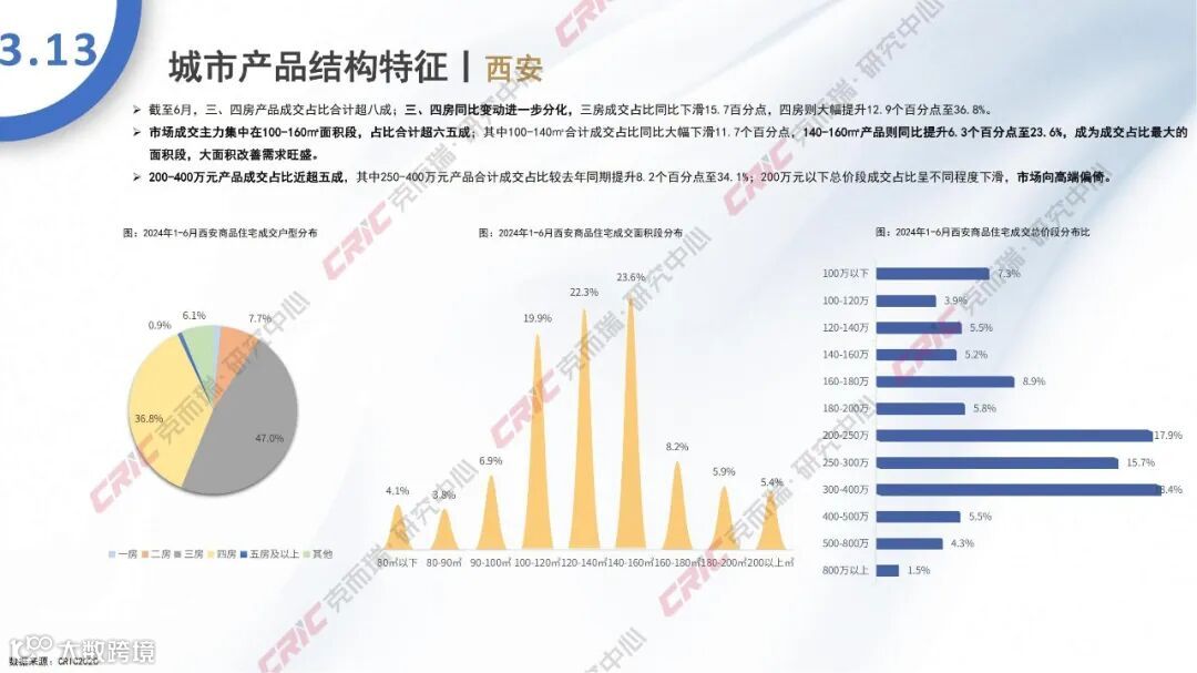 1-6月,上海豪宅逆市热销,3000万元以上产品市场份额同比大幅增加4.9个百分点至5.9%,1000-3000万元产品比重同比也有3.2个百分点的同比增幅。成都市场三、四房成交占比合计超八成,依旧占据市场主导;其中三房成交占比同比下滑5.7个百分点,降幅环比收窄,四房成交占比同步提升4个百分点,市场向改善偏倚。西安市场成交主力集中在100-160㎡面积段,占比合计超六五成;其中100-140㎡合计成交占比同比大幅下滑11.7个百分点,140-160㎡产品则同比提升6.3个百分点至23.6%,成为成交占比最大的面积段,大面积改善需求旺盛。