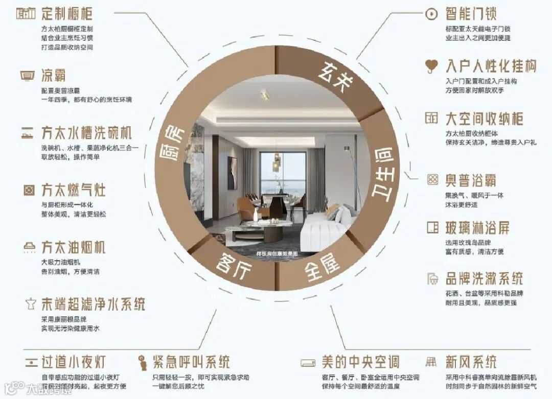 项目全装修精筑5大生活场景涵盖全屋、客厅、厨房、卫生间和玄关,打造16项精妆细节,除市场常见的美的中央空调外,还配置较为少有的中科睿赛新风系统、康丽根末端超滤净水系统,革新高端人居空间。