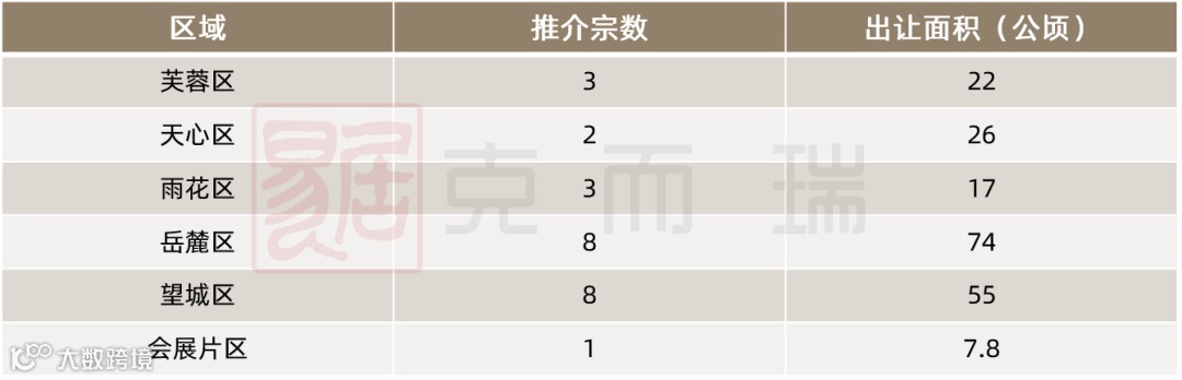 分区域来看,岳麓区和望城区依旧为供应主力区域,分别推介8宗,出让面积达74公顷和55公顷;芙蓉区和雨花区分别推出3宗,天心区推出2宗,长沙县会展片区推出1宗。开福区在本次推介手册中无地块推出。