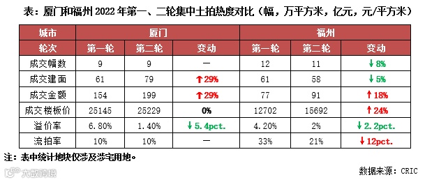 和首轮土拍相比,厦门第二轮集中土拍热度明显降温,9宗成交地块中仅触顶成交1宗,平均溢价率仅为1.4%,较首轮下降了5.4个百分点;福州土拍也凉意十足,整体溢价率降至2%,达到集中供地以来溢价率最低水平。