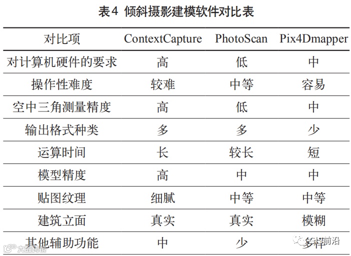 三款软件在硬件要求、操作难度、模型精度等方面有着不同的表现,根据实验结果,从多个方面综合评价三款倾斜摄影建模软件(表4)。