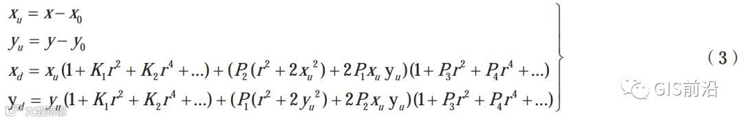 天狼星无人机搭载的是非量测相机松下GX-1,在摄影成像过程中,由于存在镜头畸变,使得实际像点位置坐标偏离理想像点坐标。该相机焦距固定,则镜头畸变属于系统误差,对每张像片产生同样的影响。本文利用直接法进行像片的畸变纠正,即将原始像片上的每个像元按照畸变改正模型进行改正,计算出改正后的对应像点坐标,并保持灰度值不变。畸变纠正模型如下: