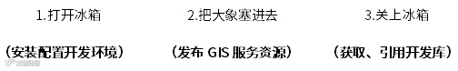 使用MapGIS Clinet for JavaScript 开发入门简单到就像把大象放进冰箱一样,分为以下三个步骤: