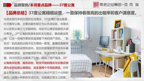 典型案例:本月典型企业案例为老牌国企背景的首钢基金创业公社旗下的长租公寓品牌——37度公寓,典型项目案例为魔方公寓旗下高端服务式公寓品牌在北京的第二个门店——魔尔公寓郎园station。