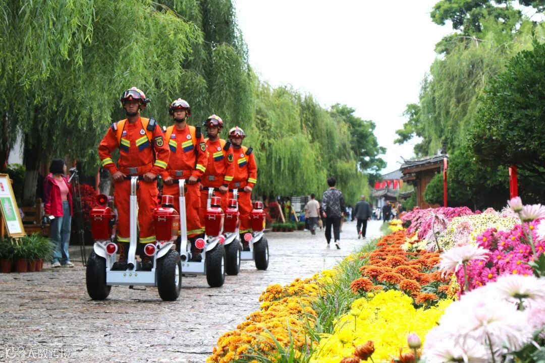 为高效守护丽江古城消防安全,丽江市消防救援支队古城站组建了一支以平衡车为交通工具的防火巡查队——“火焰蓝”平衡车便民巡查队,负责防火巡查过程中发生的初起火灾扑救、社会救助及便民服务工作并指导社区、微型消防站、商户、居民户等力量开展防火宣传工作,提高自防自救能力。