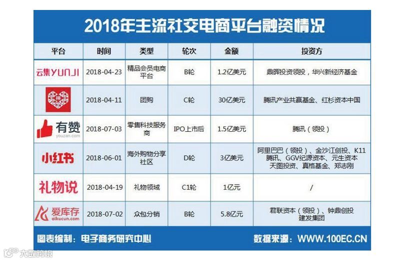 根据电子商务研究中心数据显示,2018上半年主要融资平台有6个,其中以拼多多融资金额最大,从一定程度上反映了资本对于社交电商的认可。