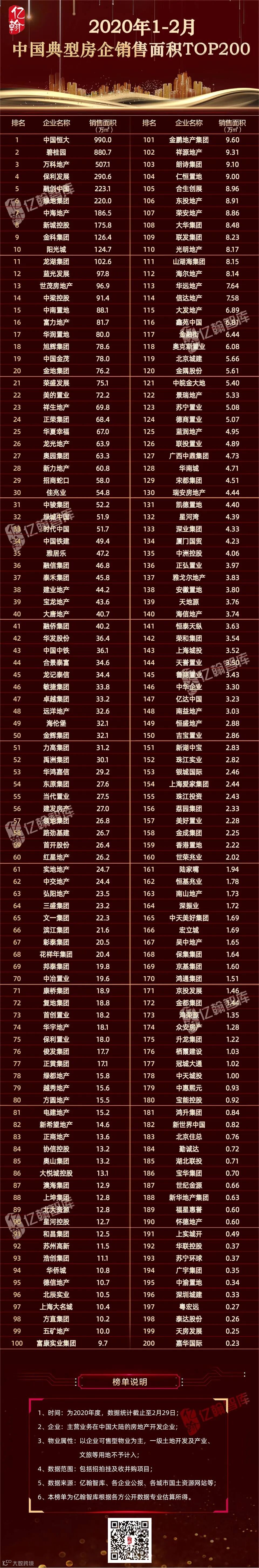 导读:2020年1-2月中国典型房企销售业绩TOP200