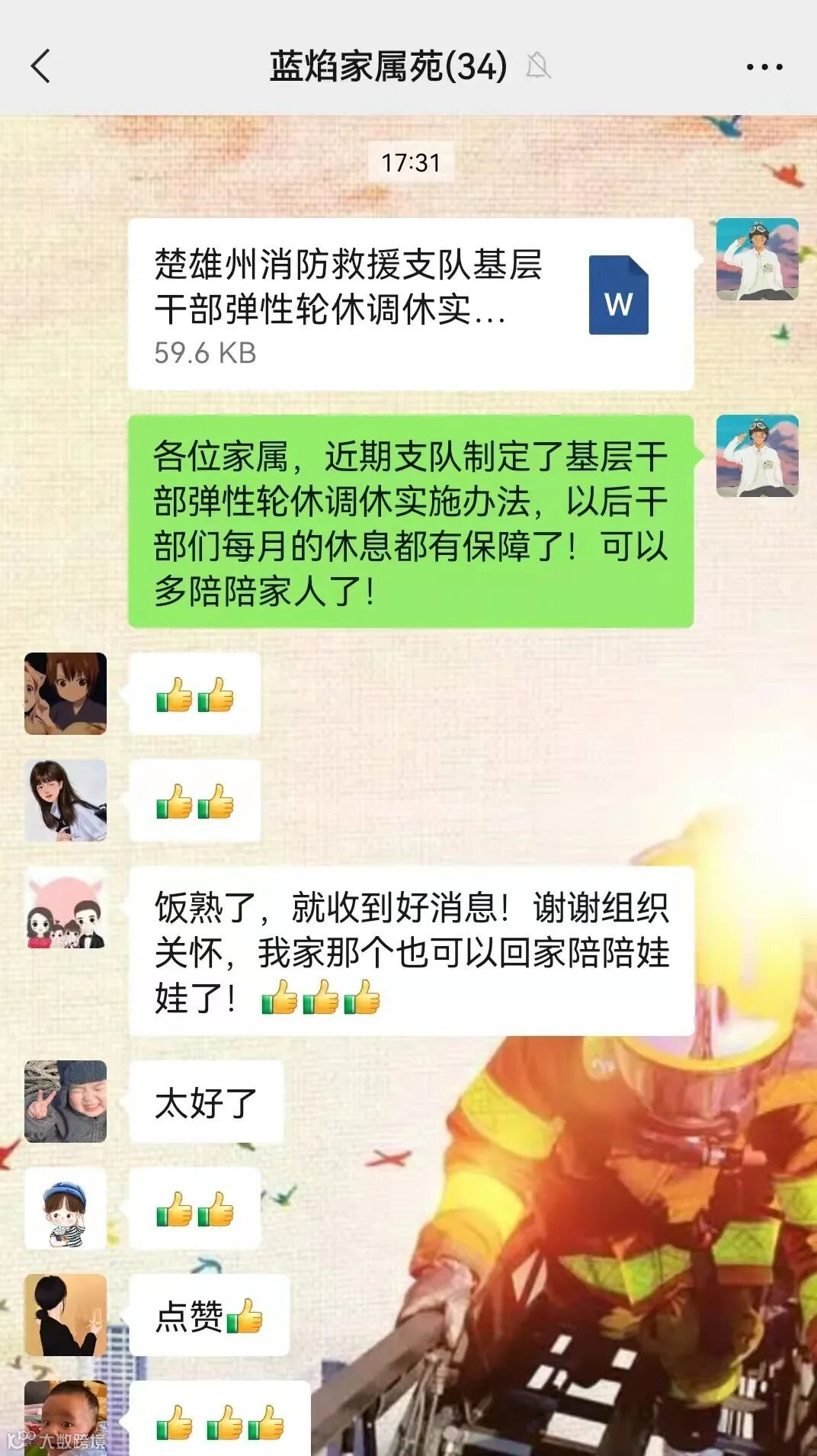 《办法》的制定为保障基层干部轮休调休提供了有力的政策支撑,并迅速在干部和家属之间引起热议。“平时我老是担心节假日值班后无法调休,现在实行弹性轮休调休后,我值班也更加安心了,工作的热情也更足了”,南华火星消防救援站政治指导员温雨凡兴奋地表示。“每逢周末和节假日,他就总是说值班,脱不开身,希望我多理解,现在实行弹性轮休调休,他在工作之余,也能抽时间回家看看、陪陪孩子了”。楚雄市雁塔消防救援站副站长何萍江的妻子谈到。