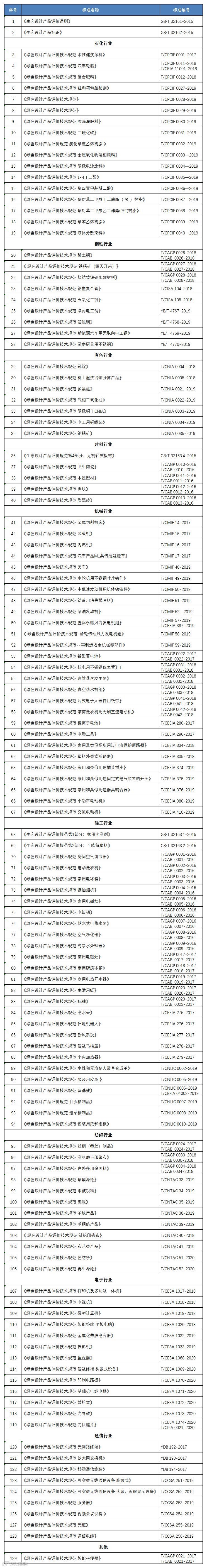绿色设计产品标准清单(2020年3月更新)