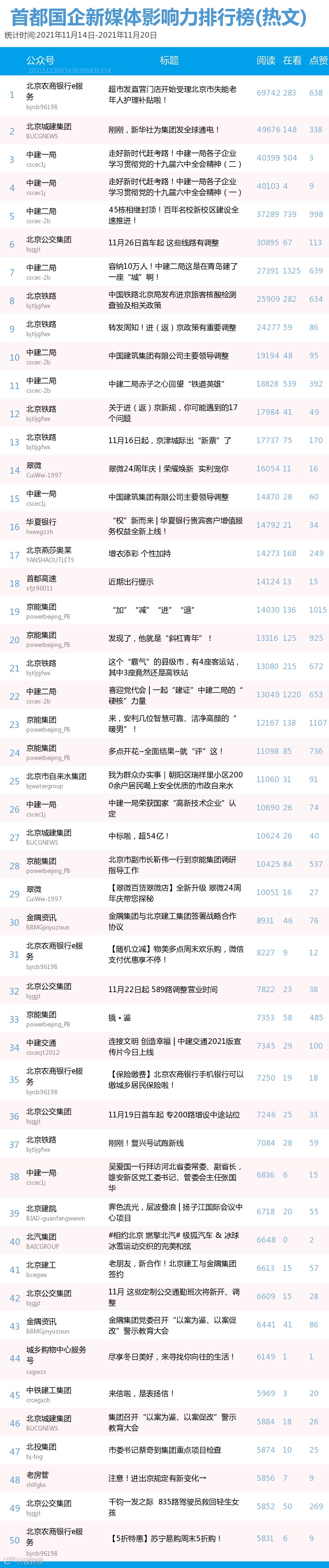 【首都国企新媒体影响力排行榜】周榜(11月14日至11月20日 第183期)