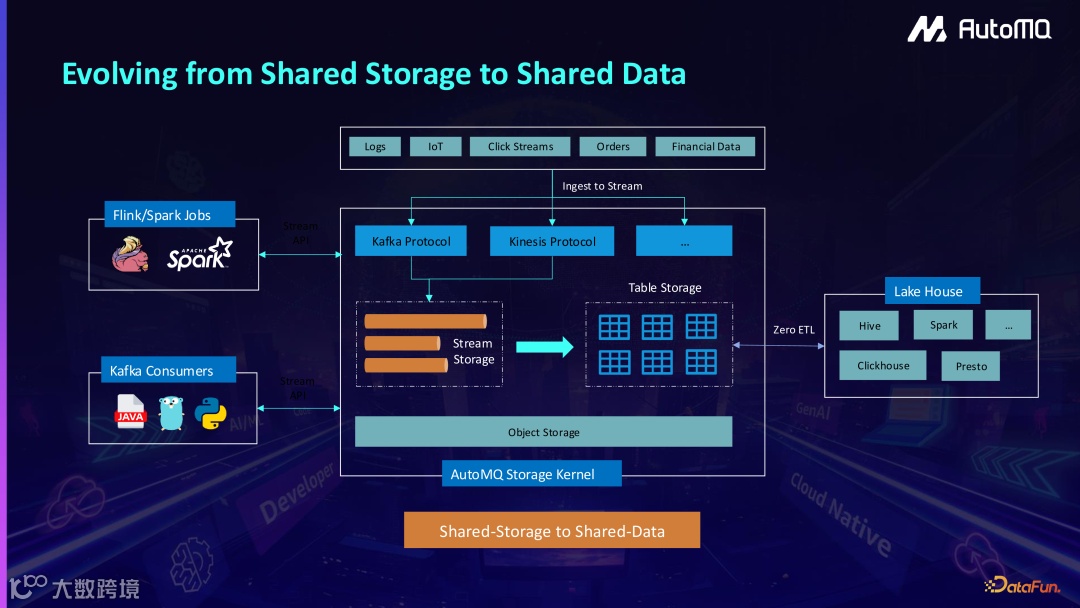 从 Apache Kafka 的传统架构开始,逐步演进到 AutoMQ 的共享存储架构,最终发展到共享数据架构。这一过程不仅展示了技术的演进,还突显了架构升级带来的成本优势和数据共享的可能性。
