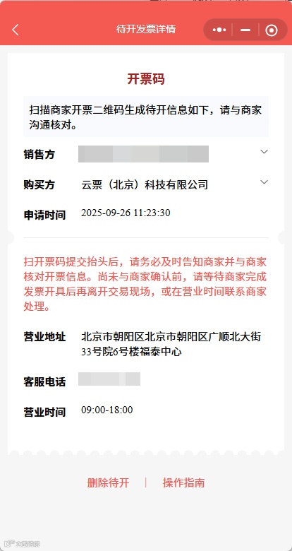 2. 填写完成后确认提交,随后请与商家确认开票信息,建议在发票开具成功后再离开现场。下图展示扫立牌提交后的待开发票信息: