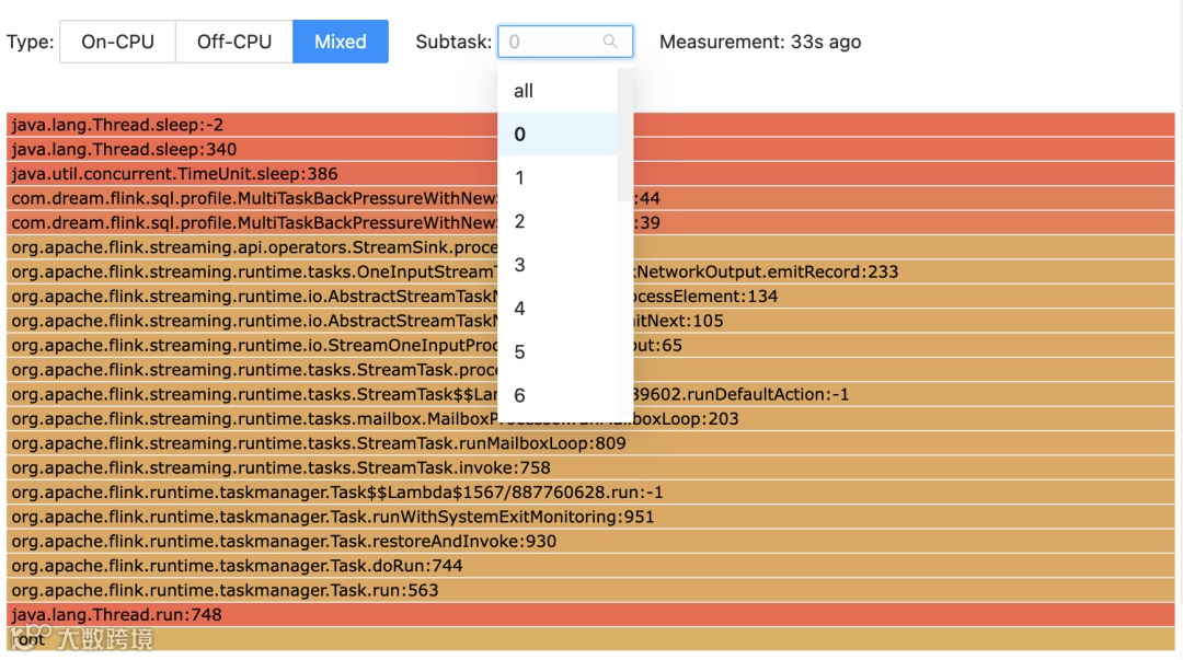 从 Flink 1.17 版本开始,Flame Graph 功能提供了针对 task 级别的可视化支持,使得用户可以更详细地了解各个 task 的性能。该功能是相比于之前版本的 Flame Graph 的重大改进,因为它可以让用户选择感兴趣的 subtask 并查看相应的火焰图。通过这种方式,用户可以确定任务可能出现性能问题的具体区域,然后采取措施加以解决。这可以显著提高用户数据处理管道的整体效率。