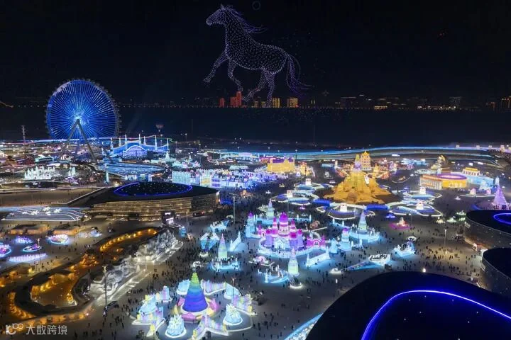 这是2026年1月5日拍摄的哈尔滨冰雪大世界园区的无人机表演(无人机照片)。新华社记者 张涛 摄