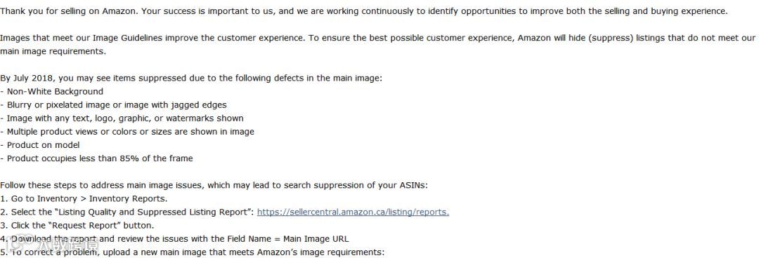 邮件内容显示,为确保最佳的客户体验,自2018年7月份开始,如果卖家主图像中存在如下几个问题,那么该Listing类目将被屏蔽整改,包括: