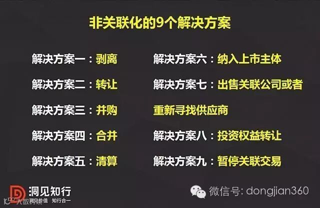 解决方案七:对于不涉及资产的关联交易,例如采购或者销售环节的关联交易,可以通过出售关联公司或者重新寻找作为独立第三方的供应商等方法进行非关联化;