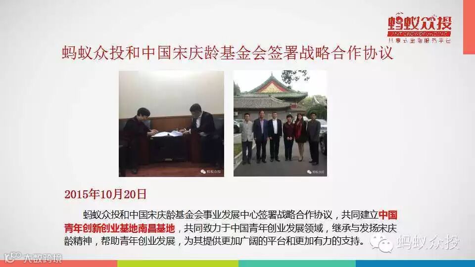 为了更好的为江西中小企业服务,蚂蚁众投与中国宋庆龄基金会事业中心签订合作协议,成立中国青年创业创新基地南昌基地。该基地,以继承和发扬宋庆龄精神为宗旨,致力于扶持帮助中小企业的发展壮大,免费为其提供一个更加广阔的创业孵化平台。