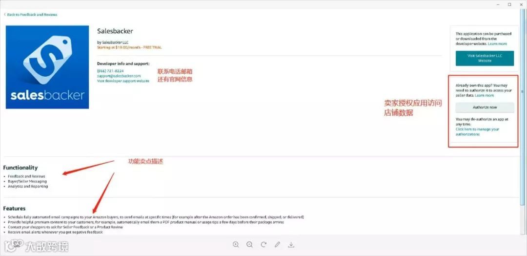 那么卖家如何使用这些应用呢,如下图,点击进入页面详情页可以看到应用的联系电话,联系邮箱,还有官网信息,我亲测邮件咨询一个问题,几乎得到秒回,目测亚马逊对这些第三方应用还是有一套自己的规范流程。下图右方就是使用应用的按钮,卖家需要点击按钮对将店铺数据的接口权限授予第三方应用,使其访问店铺数据。