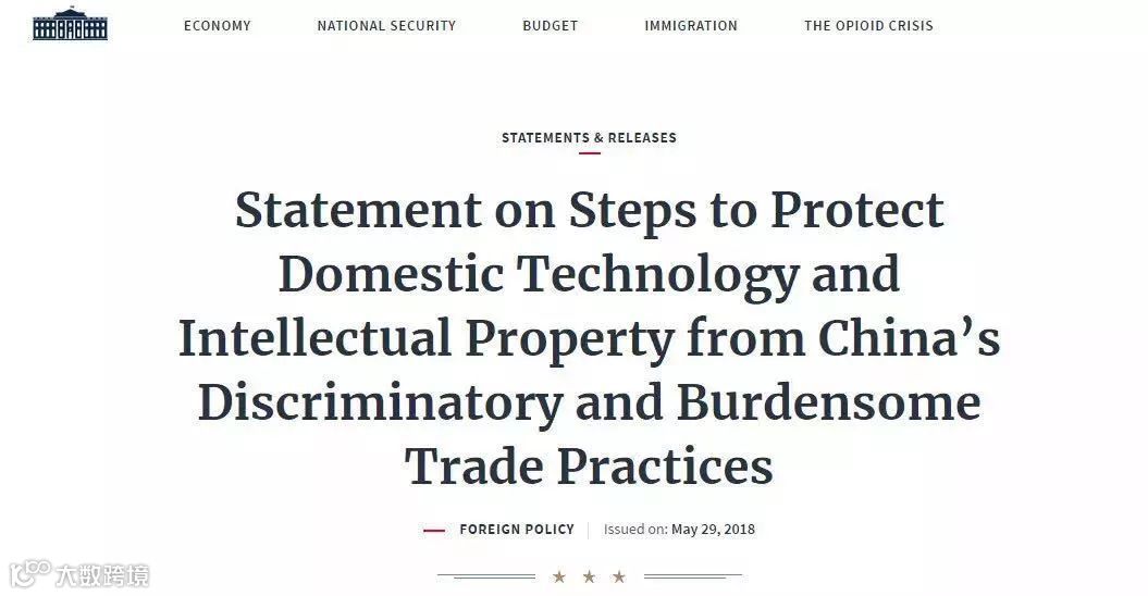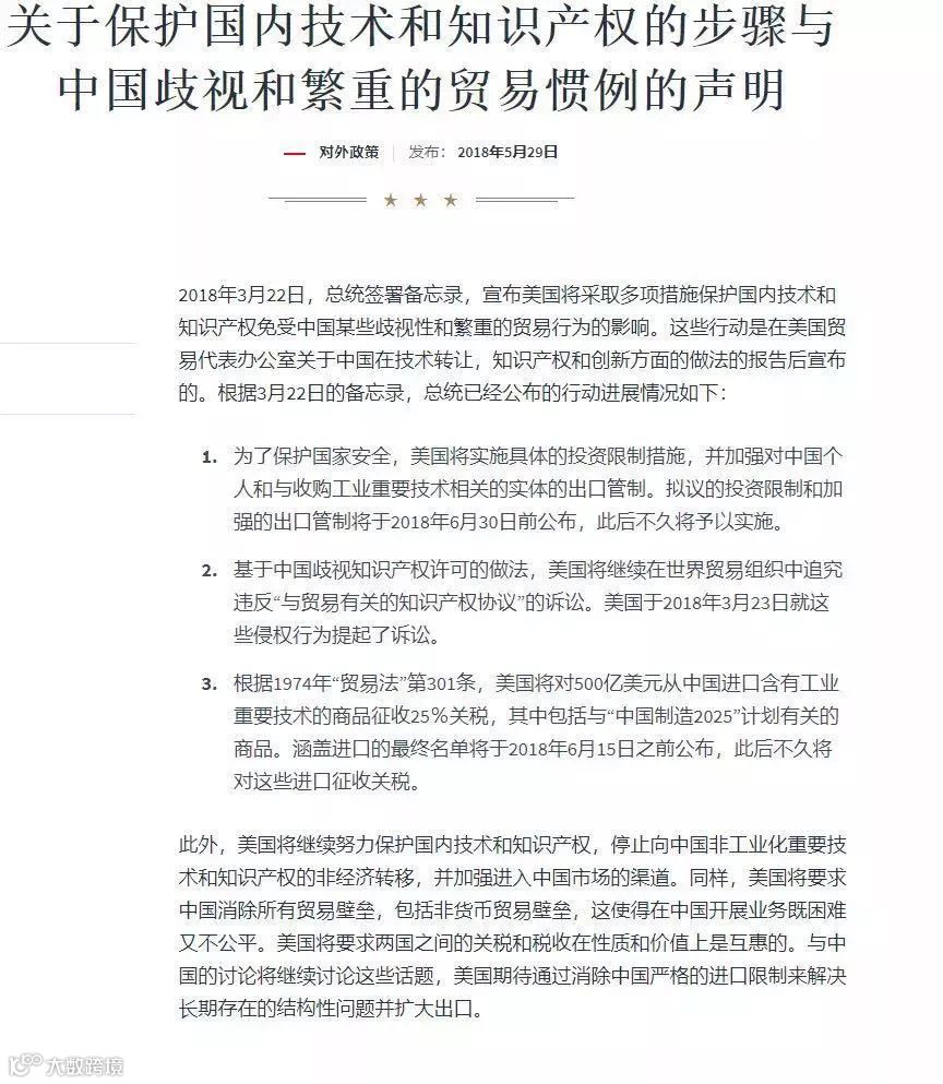 核心要点是:在6月15日,美国将公布一份中国重要工业技术商品清单,价值约500亿美元,关税上调至25%;还要继续就知识产权问题在世界贸易组织(WTO)对中方提起诉讼;要求中国消除所有贸易壁垒。