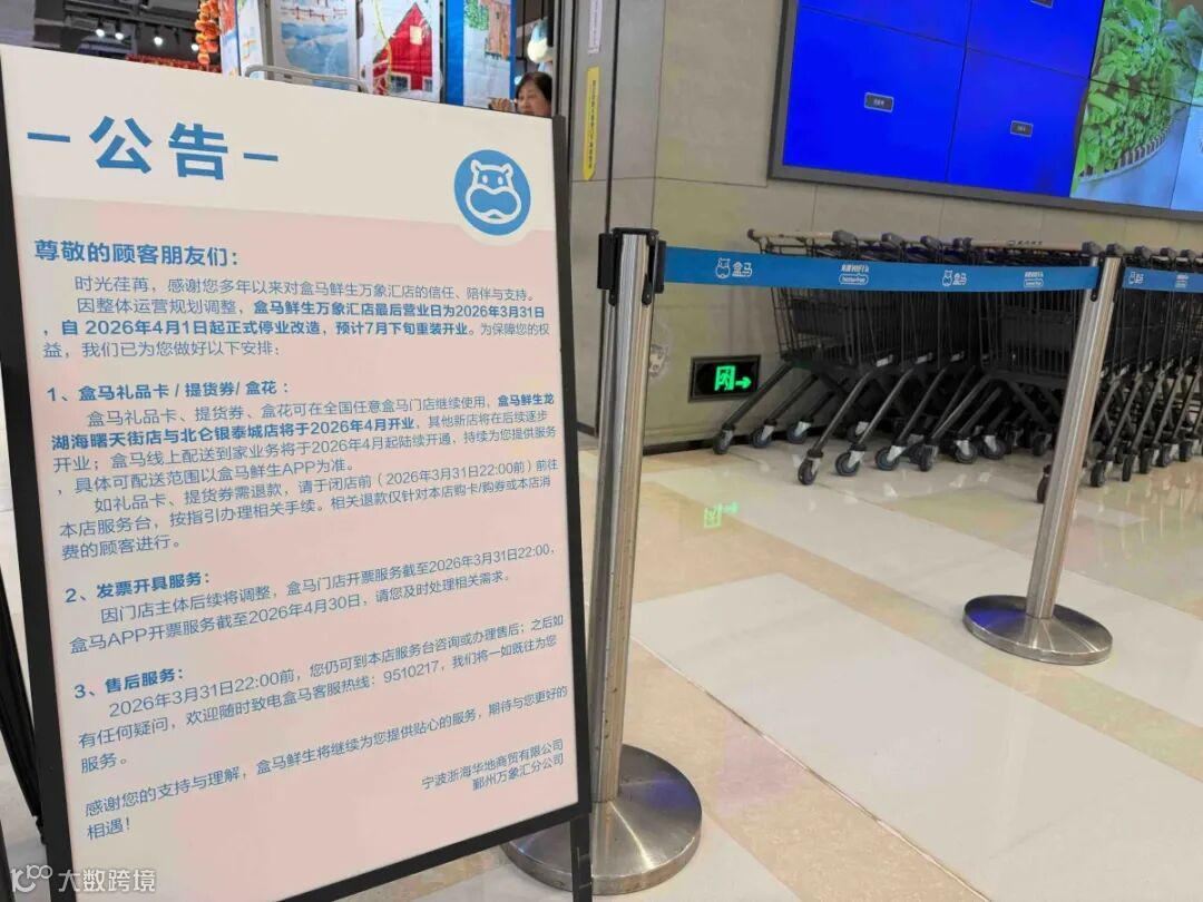 以盒马鲜生万象汇门店为例,公告称,因整体运营规划调整,盒马鲜生万象汇店最后营业日为2026年3月31日,自2026年4月1日起正式停业改造,预计7月下旬重装开业。