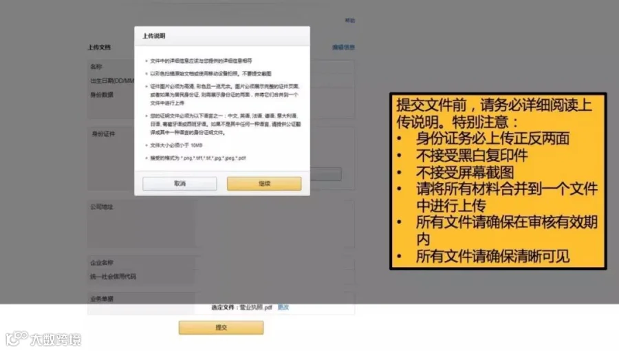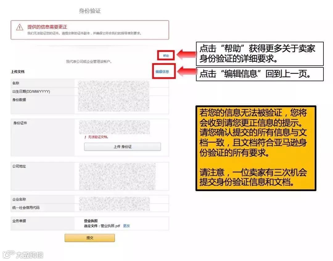卖家输入的信息(例如:法人姓名、身份证号)务必与提交的文件中的信息相符。