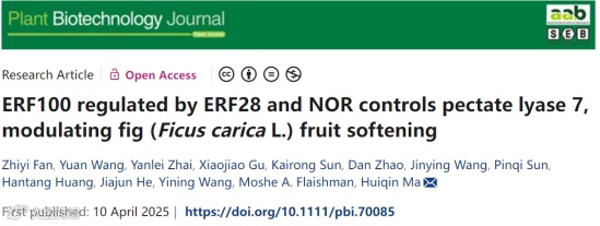 近日,中国农业大学马会勤课题组在《Plant Biotechnology Journal》发表题为“ERF100 regulated by ERF28 and NOR controls pectate lyase 7, modulating fig (Ficus carica L.) fruit softening”的研究论文。该研究揭示了ERF转录因子FcERF100通过调控细胞壁修饰基因FcPL7表达,影响无花果果实软化进程的分子机制。进一步发现,FcERF100受上游转录因子FcERF28和FcNOR双重调控,形成动态蛋白网络,在果实发育早期维持基础细胞壁修饰,并在成熟阶段促进快速软化。该成果解析了ERF-NAC复合体调控果实软化的分子路径,为果实品质改良和耐贮性育种提供了重要理论支持。