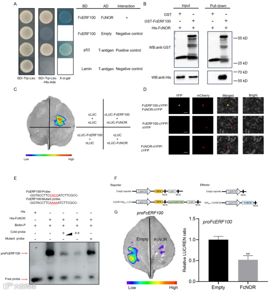 图5 FcNOR与FcERF100相互作用并转录抑制FcERF100