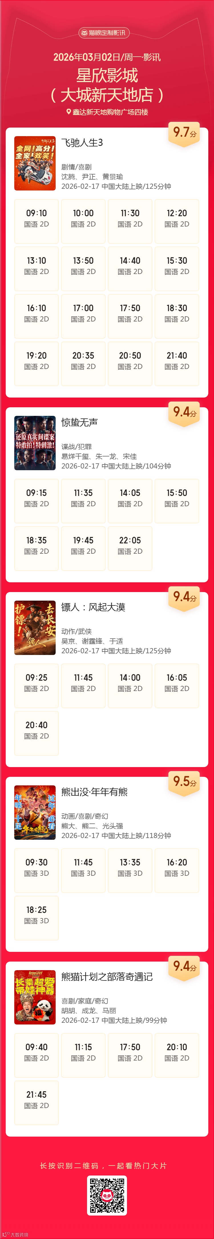 【每日影讯】~2026年3月2日影讯 大城县星欣影城