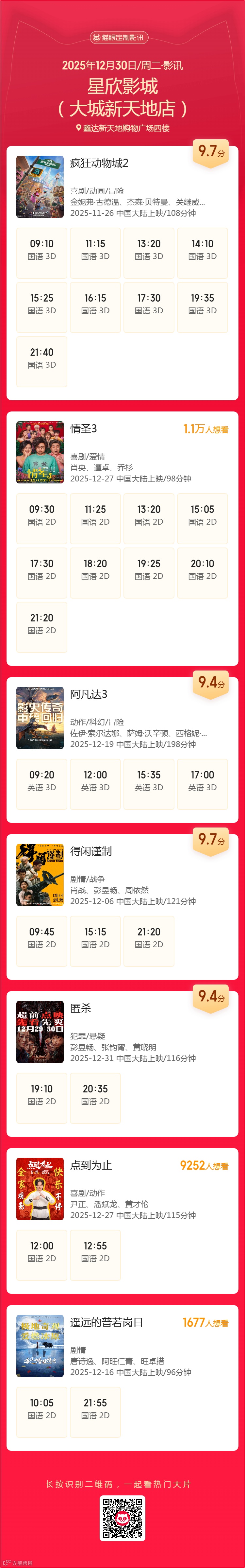 【影城地址】:大城县津保路东50号鑫达新天地购物商场4楼