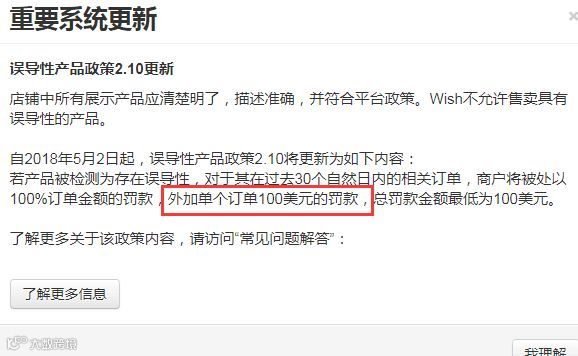 5月2日,Wish再发“误导性产品政策2.10更新”公告:自2018年5月2日起,若产品被检测为存在误导性,对于其在过去30个自然日内的相关订单,商户将被处以100%订单金额的罚款,外加单个订单100美元的罚款,总罚款金额最低为100美元。