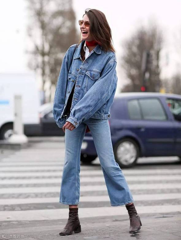 廓形牛仔外套搭配半裙与高跟鞋,既能展现小女人的柔美气质,又不失干练帅气,轻松优化身材比例。