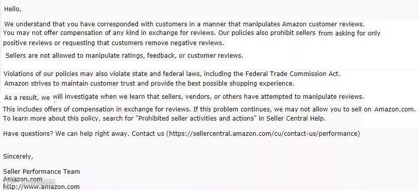 去年很长一段时间内,该办法屡试不爽,新品上的很快而且单量也不错。但是快到年底的时候,亚马逊曾经大量的删除过这种直评,还有不少卖家收到了警告信:你在操纵Review,违法并且造成了不好的客户体验,请立即收手!