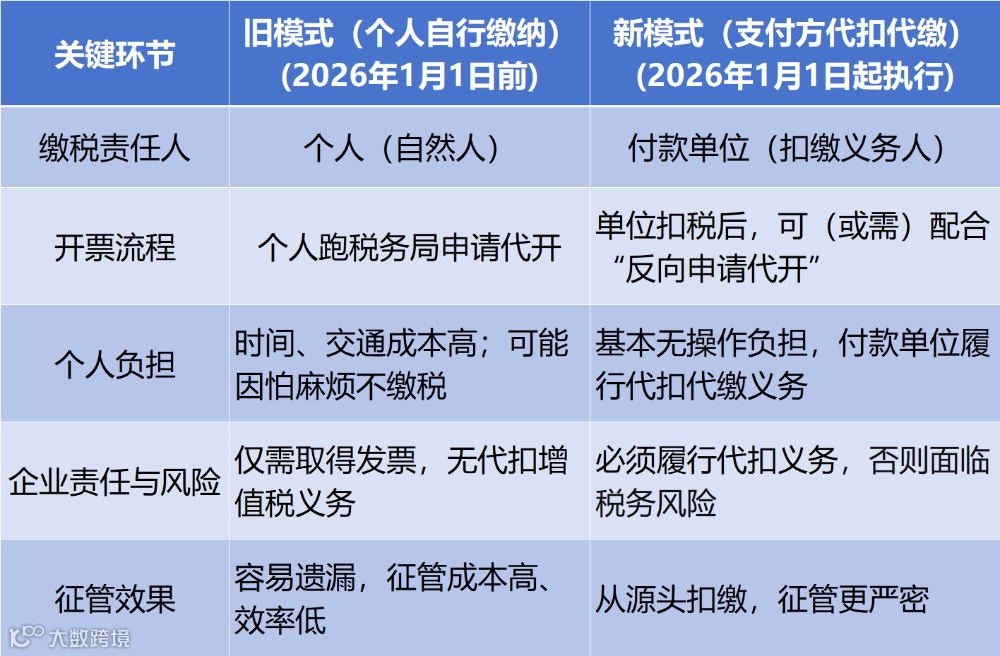 这意味着,以前个人需自行前往税务部门申报纳税的模式正在成为历史,转而由付款单位直接扣缴。今后,类似专家授课、设计师接单、临时技术服务等场景,付款方不仅需代扣个人所得税,还必须同步代扣增值税。