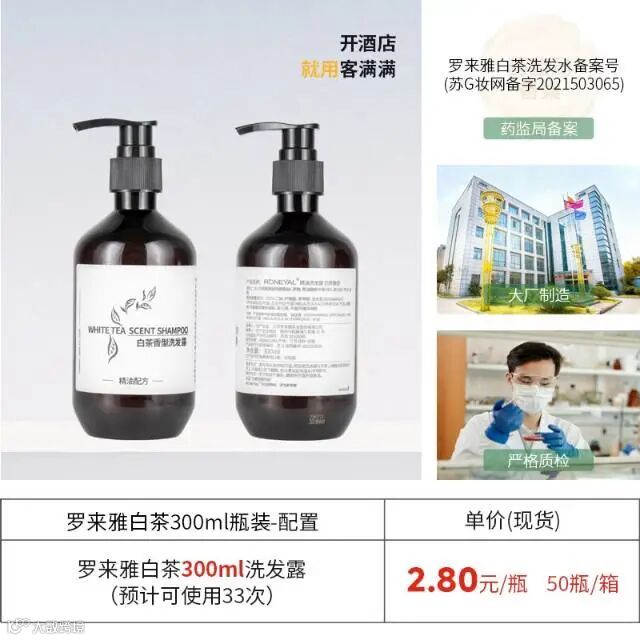 江苏罗来雅大厂生产。洁净车间,液体合格。检验报告,批次检验报告,化妆品备案齐全,解除酒店市场检查等后顾之忧。价格实惠:300毫升洗发露2.8元,300毫升沐浴露2.8元。满50瓶140元,山东省内即可包邮到门。