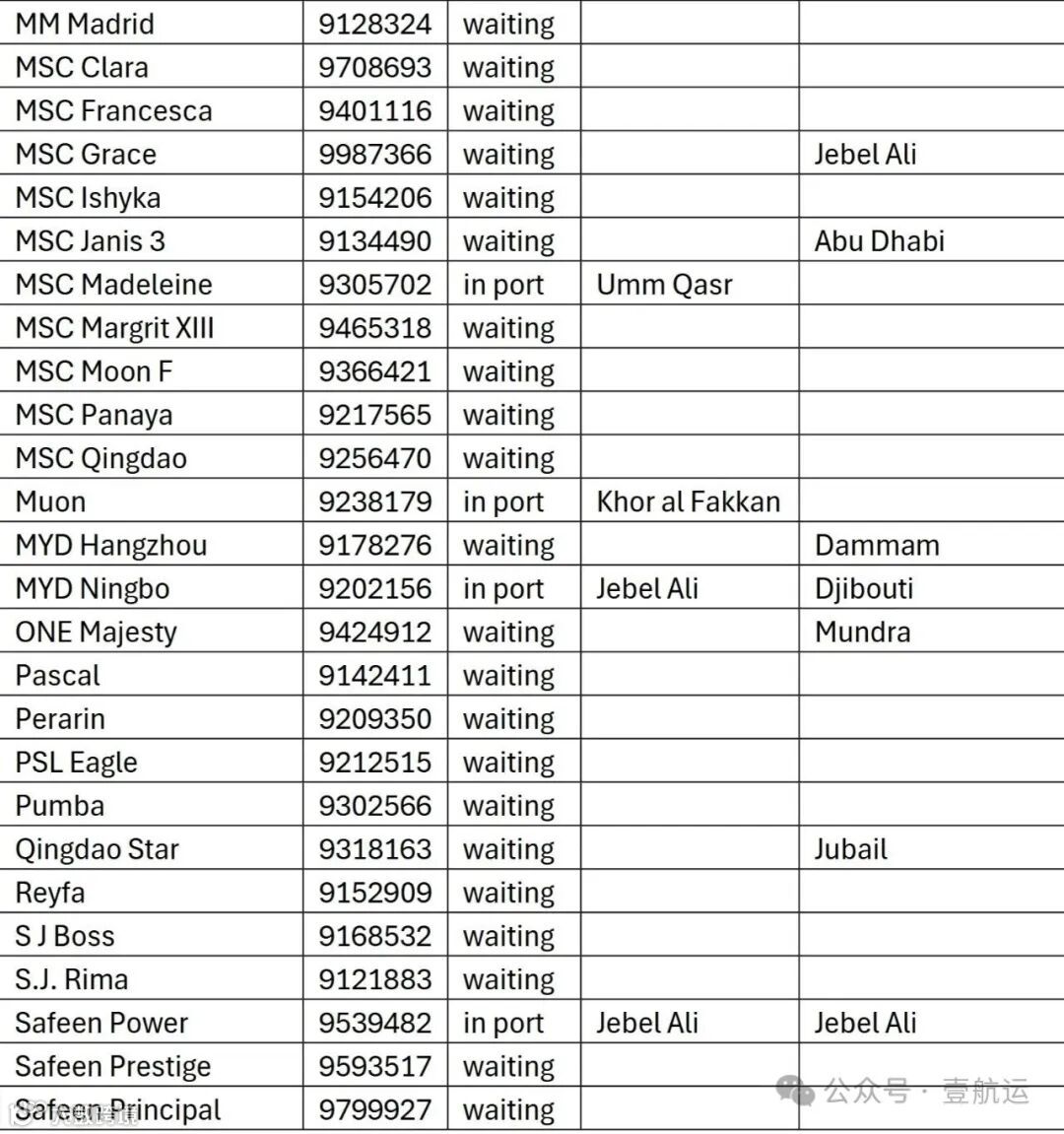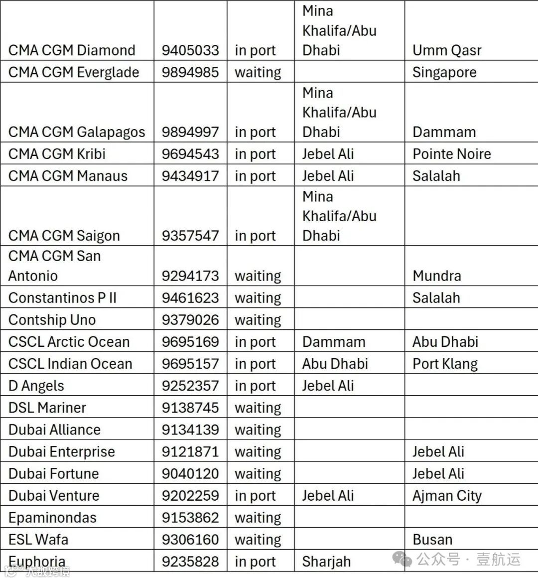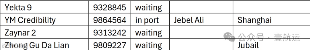 滞留船舶主要停靠在多哈港、杰贝阿里港等周边港口,或在避难区等待进一步指令。其中运力较大的包括: