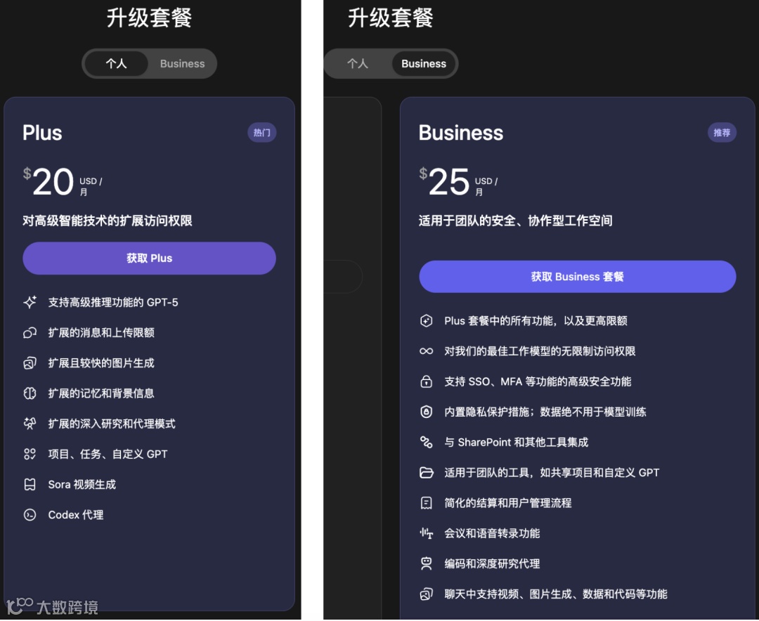 - 隐私保障:Plus默认将聊天记录用于模型训练;Business完全禁用该功能,数据不参与训练;